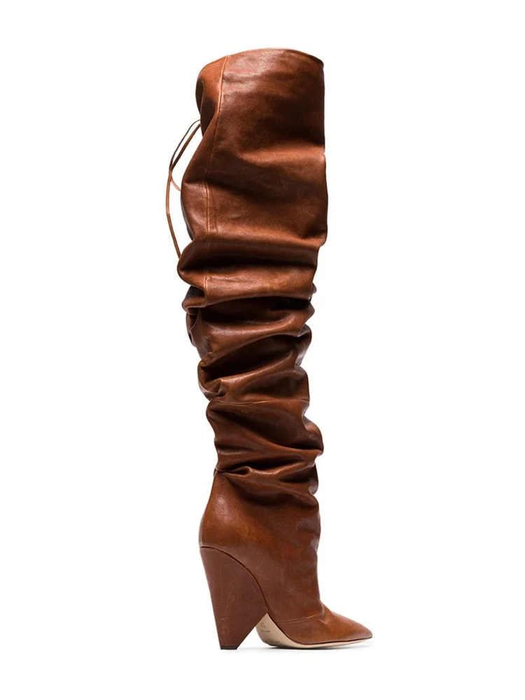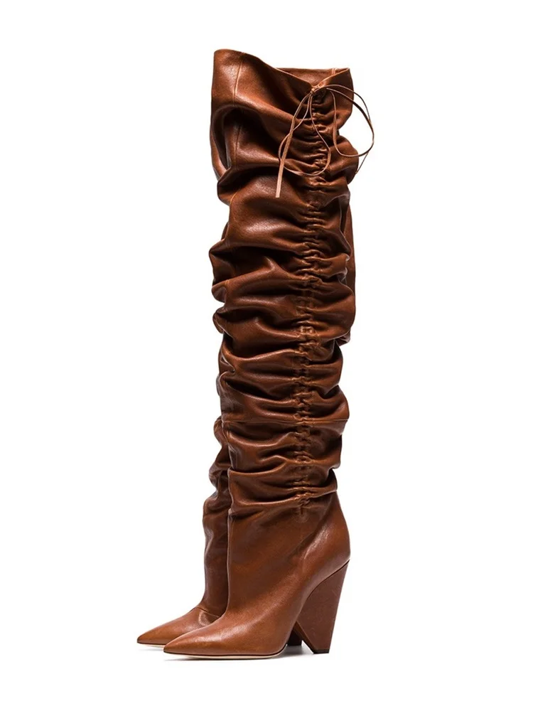 ✴️(50%OFF) Goede Koop Echt Lederen Schoenen Winter Vrouw Vreemde Stijl Hakken Laarzen Stretch Strap Geplooide Knie Hoge Lange Wees Teen Goedkoop