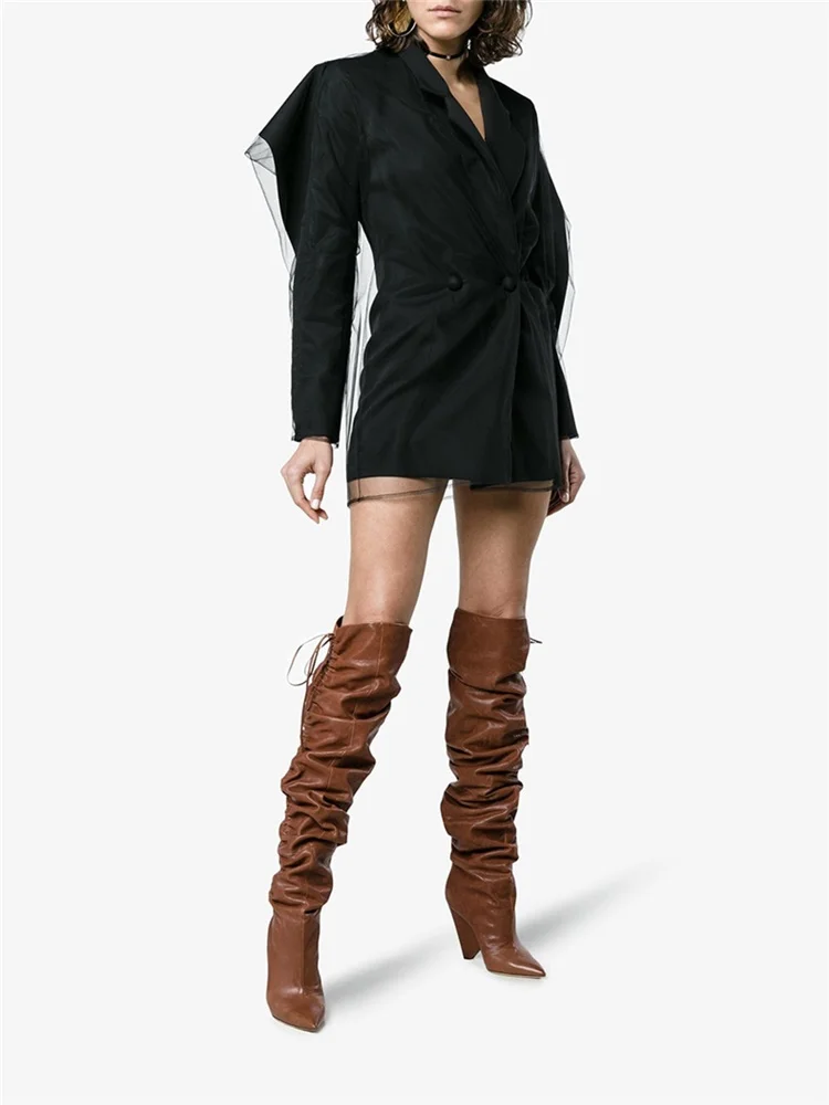 Product Name: Echt Lederen Schoenen Winter Vrouw Vreemde Stijl Hakken Laarzen Stretch Strap Geplooide Knie Hoge Lange Laarzen Wees Teen Winter Laarzen