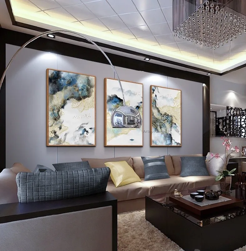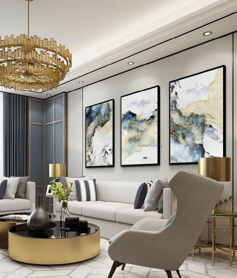 Product Name: Moderne Abstracte Blauwe Canvas Olieverf Goud Lijn Hand Painted Wall Art Foto Voor Woonkamer Hal Home Decor Cuadros