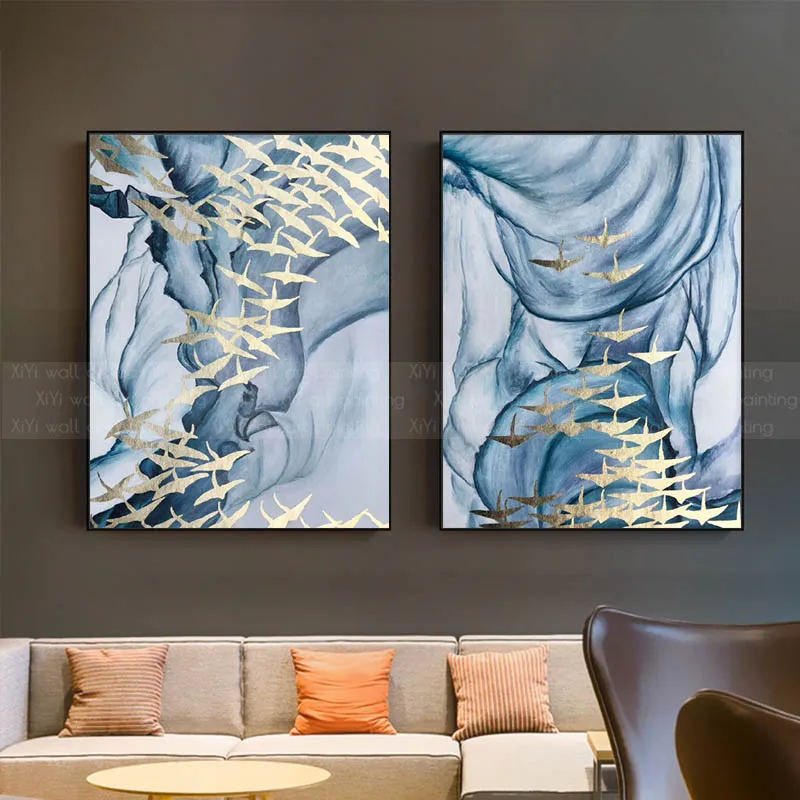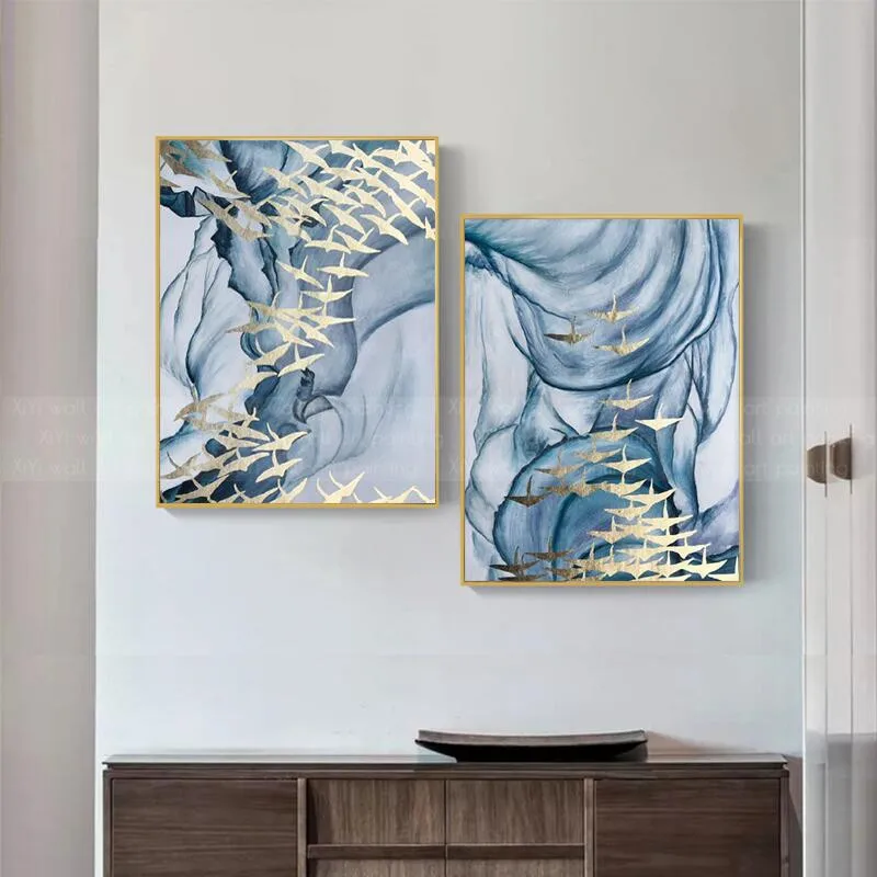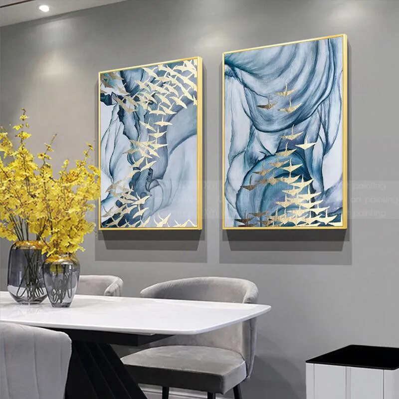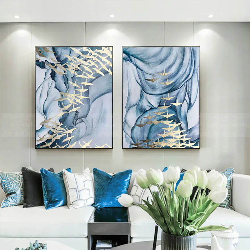 Product Name: 2 Stuks Gold Vogel Abstract Canvas Schilderij Blue Wall Art Foto's Voor Woonkamer Thuis Wall Decor Originele Textuur Decoratie