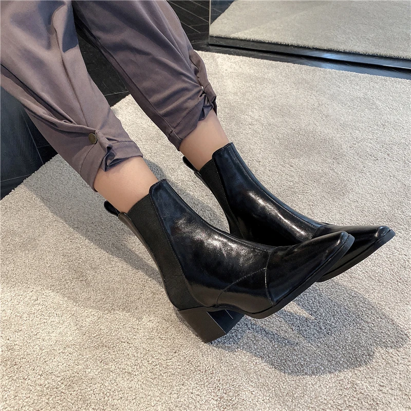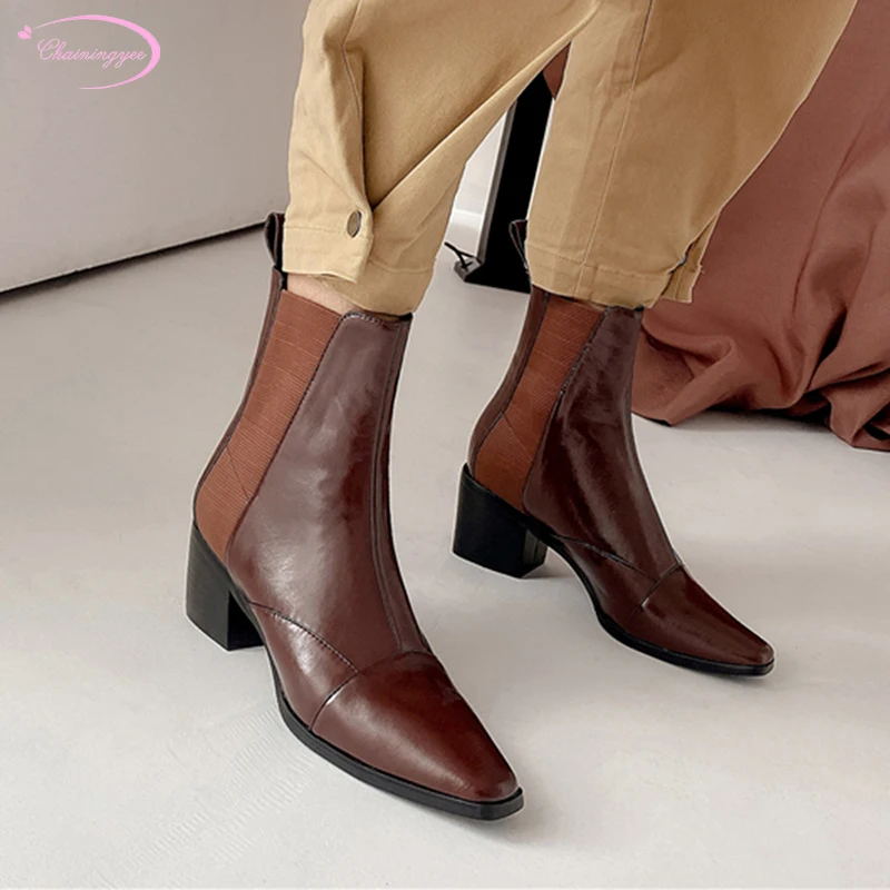 Special Offer Casual Real Leather Vierkante Teen 2020 Nieuwe Aankomen Enkellaars Stretch Zwart Bruin Hoge Hakken Dikke Motorlaarzen Vrouwen Schoenen Discount 42% Today!