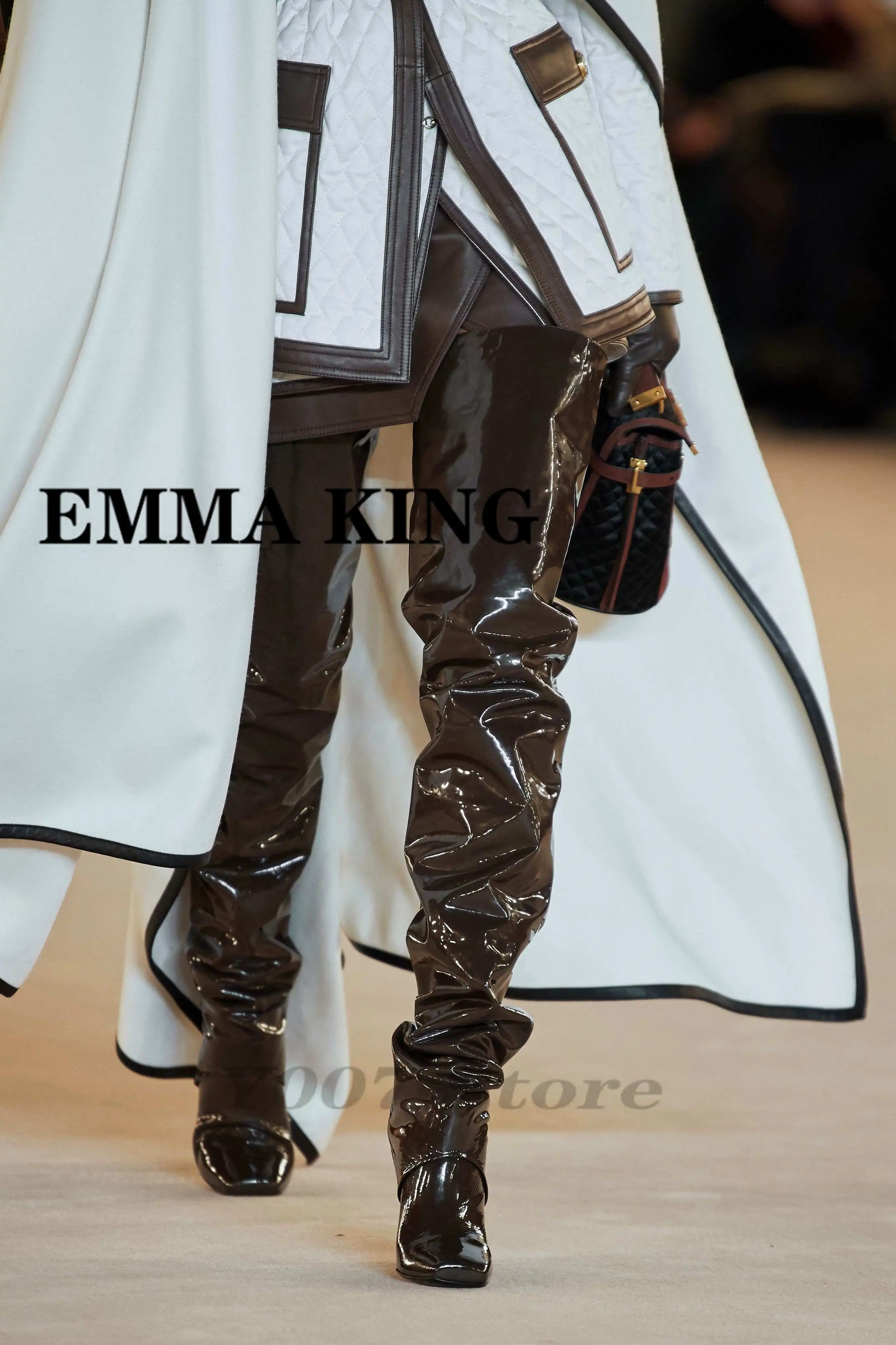 Product Name: 2021 Nieuwe Lakleer Dij Hoge Winter Laarzen Vierkante Teen Elastische Stretch Over De Knie Laarzen Runway Spike Hakken Vrouwen Laarzen