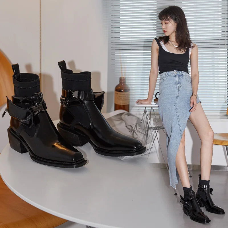 Product Name: Echt Leer Womens Vierkante Teen Biker Laarzen Ritsen Slip-On Gesp Spliced Vintage Koeienhuid Winter Warm Fashion Enkel Boot