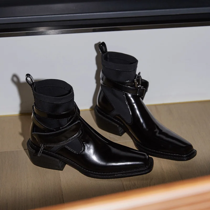 🎋(43%OFF) Kopen Goedkoop Echt Leer Womens Vierkante Teen Biker Laarzen Ritsen Slip On Gesp Spliced Vintage Koeienhuid Winter Warm Fashion Enkel Boot Prijs