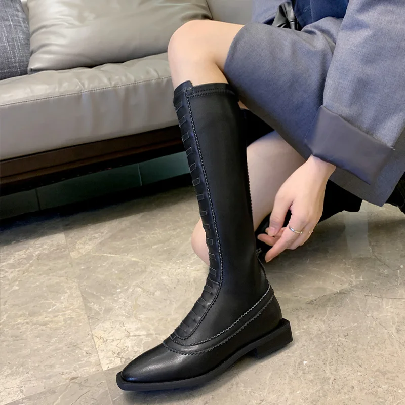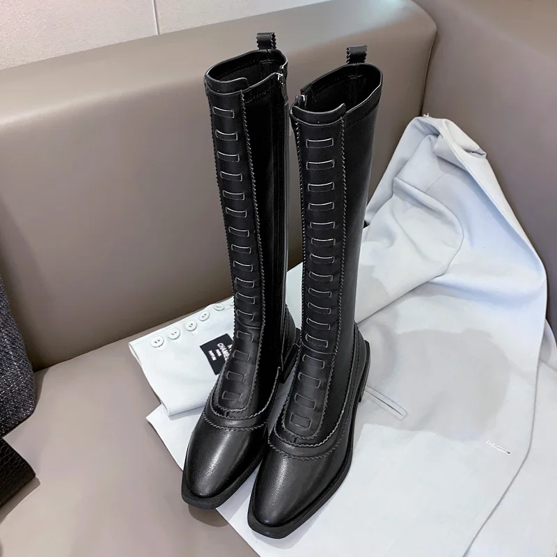 Product Name: Witte Dij Hoge Laarzen Vrouwen Stretch Slim Lange Laarzen Vierkante Teen Natuurlijke Koeienhuid Knie Hoge Ridder Laarzen Winter Warme Schoenen Vrouwelijke